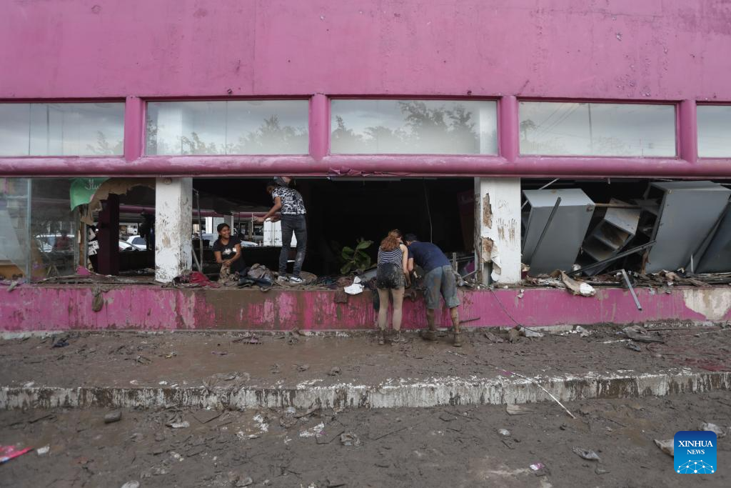 People clean silt at a house in the city of Poza Rica, Veracruz state, Mexico, on Oct. 11, 2025. At least 41 people have been killed as torrential rains and landslides battered Mexico in recent days. (Photo by Francisco Canedo/Xinhua)