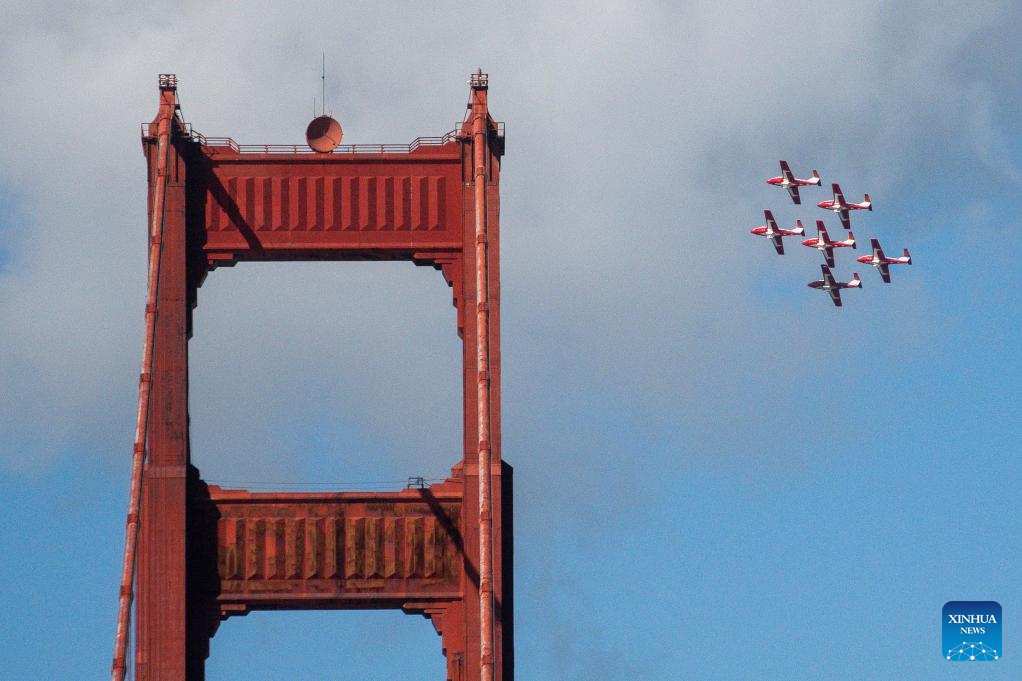 The Canadian Snowbirds perform during the annual Fleet Week air show in San Francisco, California, the United States, on Oct. 11, 2025. (Photo by Ziyu Julian Zhu/Xinhua)