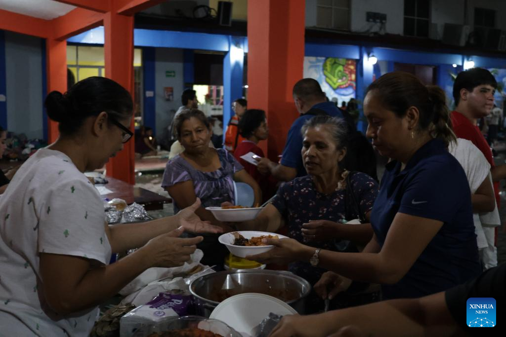 People affected by the heavy rain receive food at a shelter in the city of Poza Rica, Veracruz state, Mexico, Oct. 12, 2025. (Photo by Francisco Canedo/Xinhua)