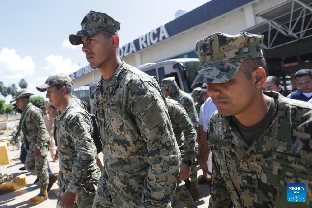 Mexican soldiers prepare to help people affected by the heavy rain in the city of Poza Rica, Veracruz state, Mexico, Oct. 12, 2025. (Photo by Francisco Canedo/Xinhua)
