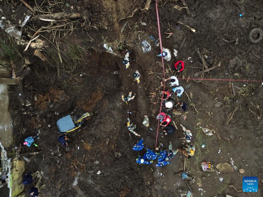 This aerial drone photo taken on Oct. 13, 2025 shows rescue workers conducting a search in a landslide caused by the heavy rain in Huauchinango, Puebla state, Mexico. (Photo by Francisco Canedo/Xinhua)
