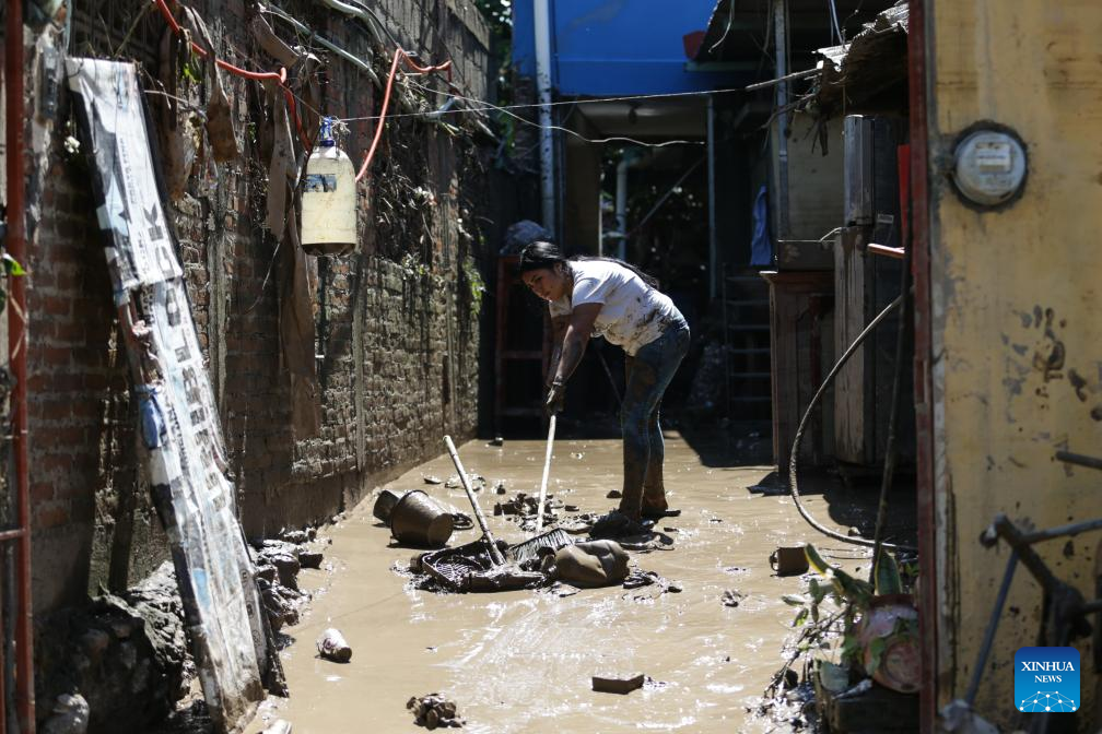 A woman tries to clean a street flooded by the heavy rain in the city of Poza Rica, Veracruz state, Mexico, Oct. 12, 2025. (Photo by Francisco Canedo/Xinhua)