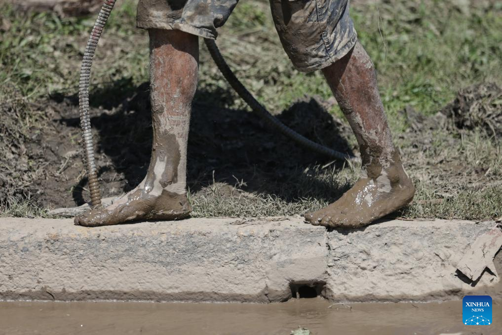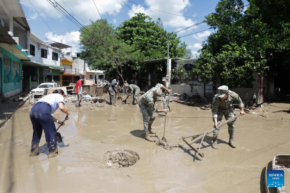 Mexican soldiers help to clean a street affected by the heavy rain in the city of Poza Rica, Veracruz state, Mexico, Oct. 12, 2025. (Photo by Francisco Canedo/Xinhua)