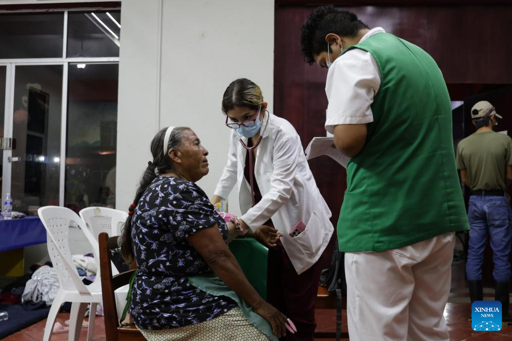 A woman receives medical treatment at a shelter for flood victims in the city of Poza Rica, Veracruz state, Mexico, Oct. 12, 2025. (Photo by Francisco Canedo/Xinhua)