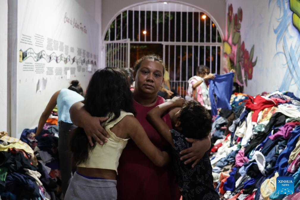 A woman hugs her children at a shelter for flood victims in the city of Poza Rica, Veracruz state, Mexico, Oct. 12, 2025. (Photo by Francisco Canedo/Xinhua)