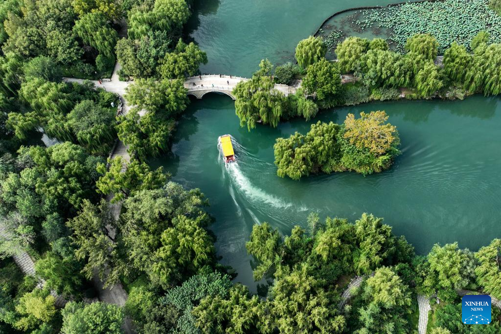 An aerial drone photo taken on Oct. 13, 2025 shows tourists taking a boat tour at a scenic spot in Jinan City, east China's Shandong Province. (Photo by Hao Xincheng/Xinhua)