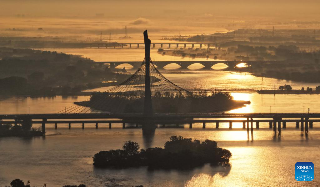 An aerial drone photo taken on Oct. 13, 2025 shows a view of Hutuo River in Shijiazhuang, north China's Hebei Province. (Photo by Chen Qibao/Xinhua)