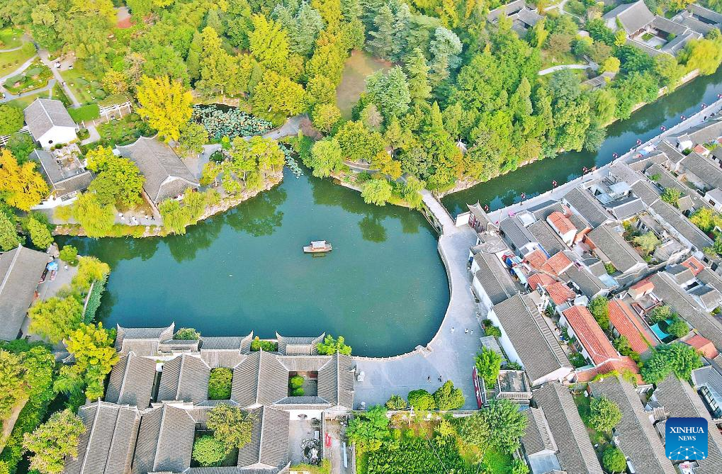 An aerial drone photo taken on Oct. 13, 2025 shows tourists visiting the Baotu Spring in Jinan City, east China's Shandong Province. (Photo by Hao Xincheng/Xinhua)