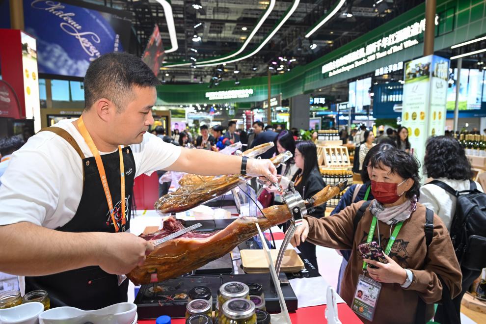 11月5日,在第八届进博会农食产品展区,参展商为观众介绍伊比利亚火腿。