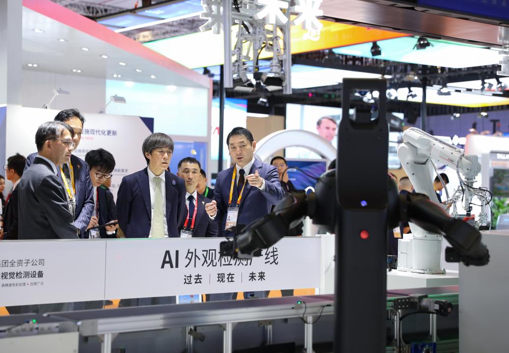 11月5日,观众在第八届进博会技术装备展区三菱电机展台了解AI外观检测产线。