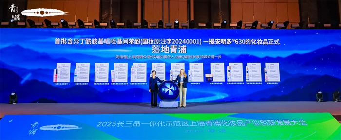 作为上海市化妆品产业政策落地的“标杆案例”,在与会嘉宾的共同见证下,中国香料香精化妆品工业协会理事长颜江瑛,拜尔斯道夫执行董事会董事卢柏珊女士(Grita Loebsack)共同为含有首个美白祛斑新原料提安明多®630的化妆品正式落地青浦揭幕。