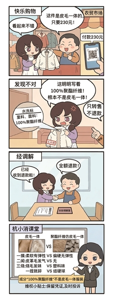 前不久,消费者徐女士向本报维权热线85188518反映,她于去年12月27日,在西湖区丽景路78号杭州丽景路农贸市场二楼051号商铺,支付230元购买了一件短款白色外套。“商家称衣服是‘皮毛一体’,我买回家后才发现衣服没有吊牌,水洗标写明里料和面料是‘100%聚酯纤维’。”徐女士想要退款,商家却称只能帮忙转售衣服。