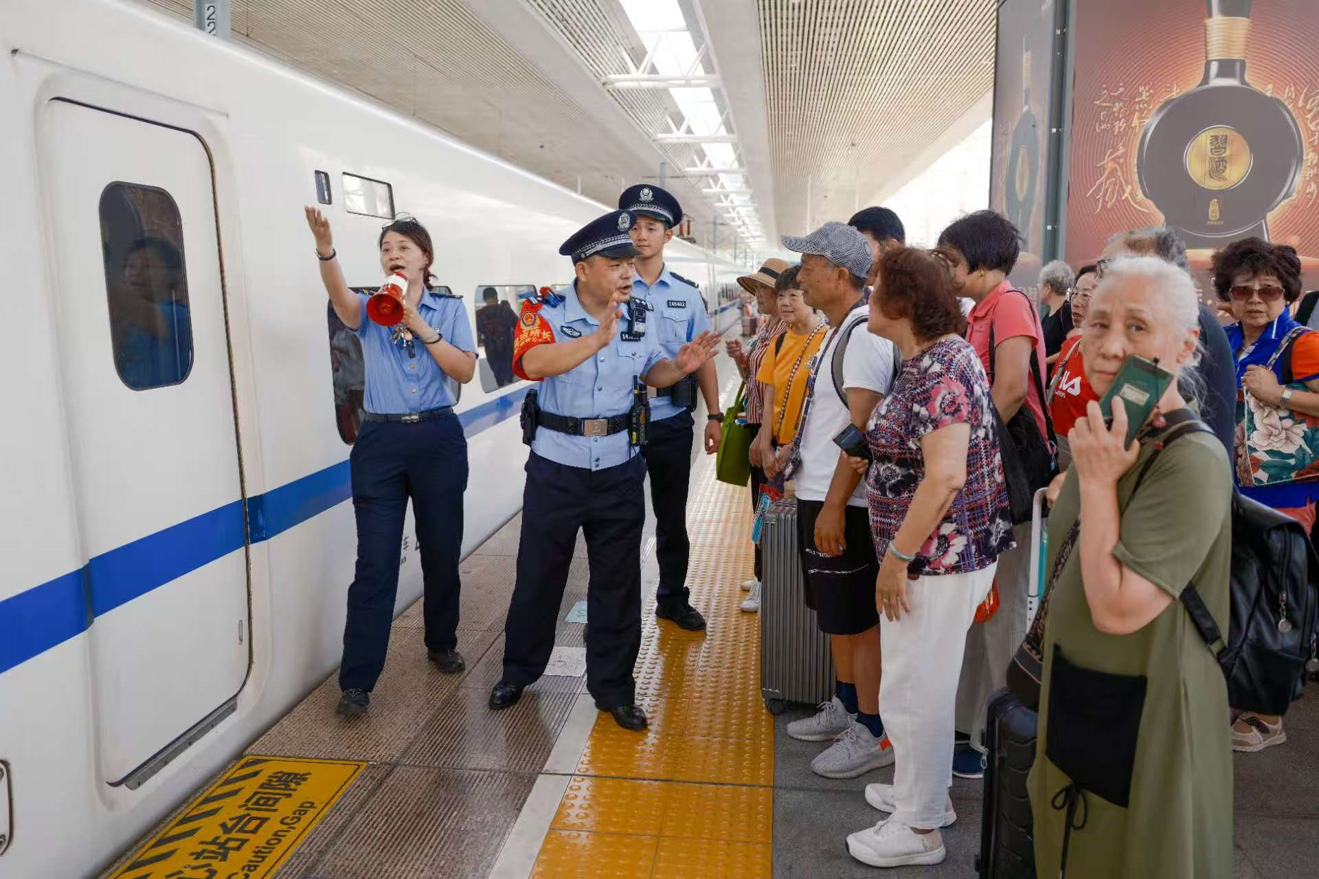 林芳德(左二)疏导候车乘客