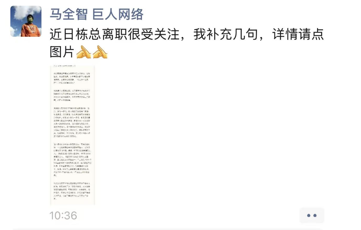 非常感谢业界朋友这两天对巨人的关心。公告出来,关注度很高,外界甚至内部不少朋友感觉突然。主要关心两问题,一栋总为什么离开?二对巨人影响有多大?