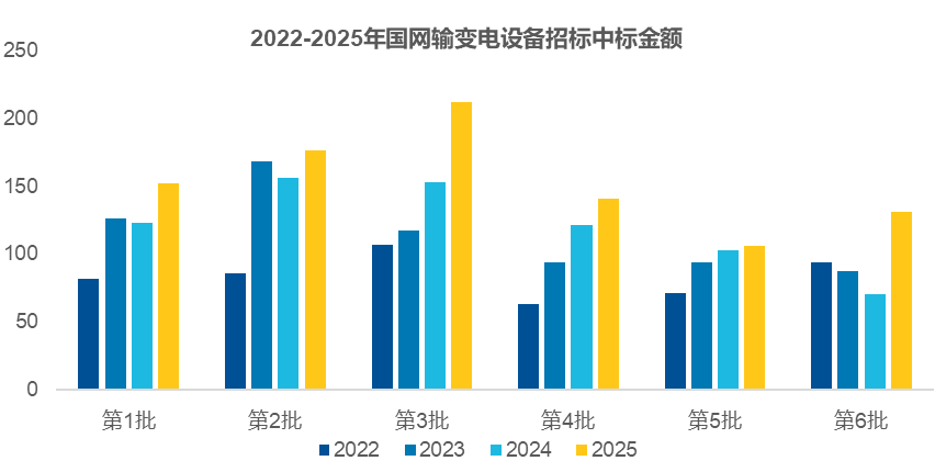 以国网的输变电设备的整体招标金额为例,如下图所示,2025年国网输变电设备的每一批次招标金额均高于历史同期,反映出对输变电设备的需求增长。