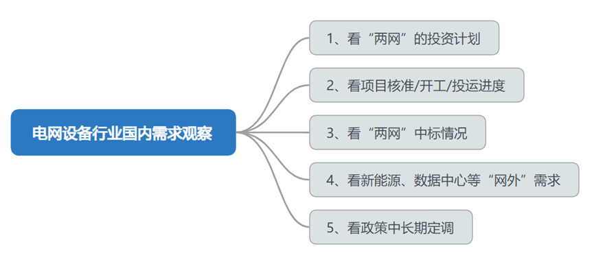 具体来看,电网设备的国内需求可以从以下5点着手观察: