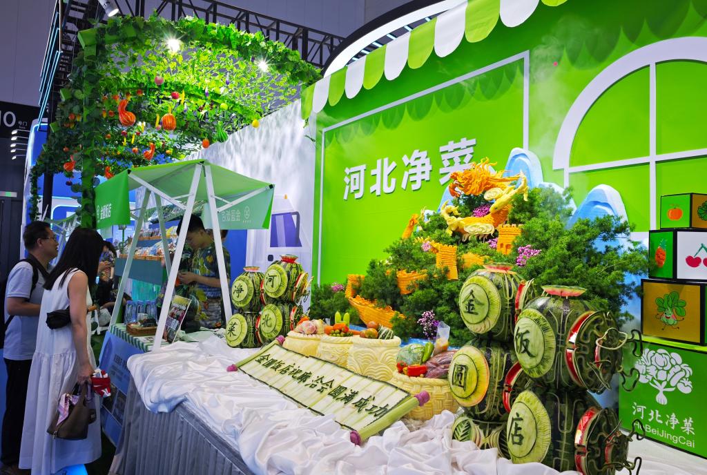 在河北净菜展位,经过洗涤、沥水、去皮、切削等多道工序加工而成的瓜果蔬菜,整齐摆放在展台上,供与会嘉宾和市民品尝。生活中,早晨采摘自河北田间的蔬菜,晚上就能端上京津市民的餐桌。