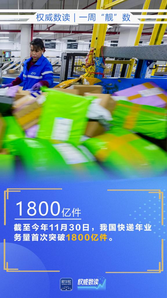 前10个月,我国服务进出口总额65844.3亿元;智能手机产量10.2亿台;截至11月30日,快递年业务量首次突破1800亿件……本周,这些数据最值得关注!