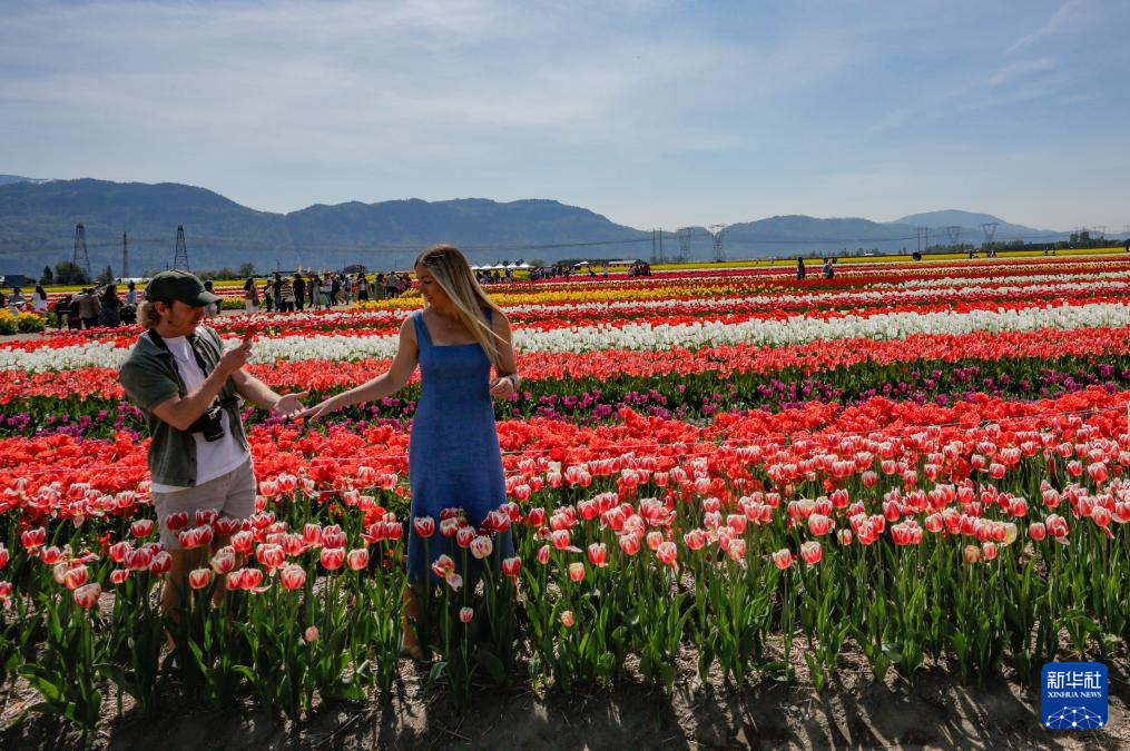 4月25日,在加拿大阿伯茨福德市,人们在郁金香田中留影。