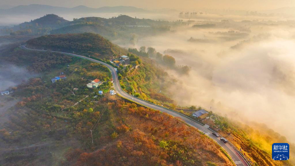 11月4日在山东省临沂市沂南县界湖街道拍摄的被云雾笼罩的朱家岭村(无人机照片)。