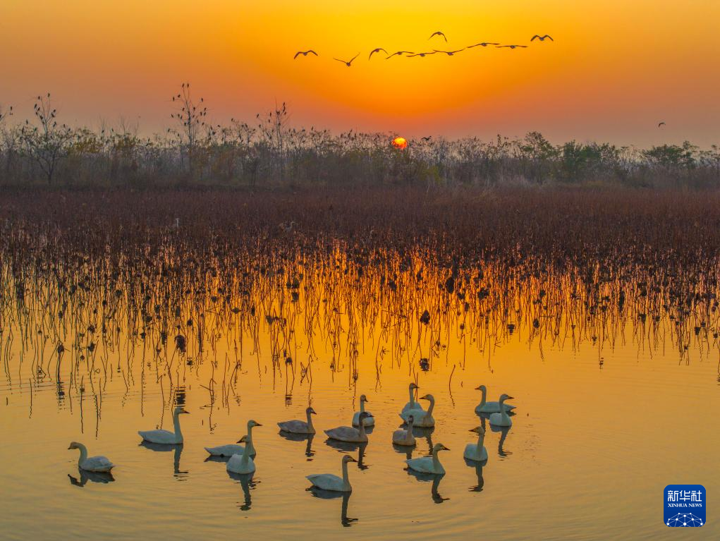11月30日,群鸟在江苏兴化里下河国家湿地公园内栖息、觅食(无人机照片)。