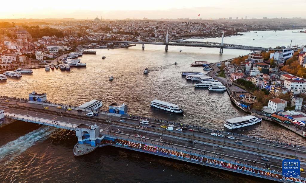 11月24日,夕阳的光辉照耀在土耳其伊斯坦布尔金角湾的水面上。