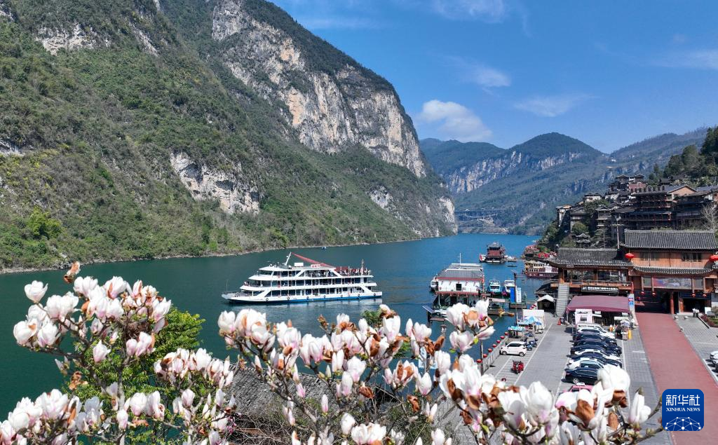 3月10日,游船行驶在乌江重庆市酉阳土家族苗族自治县龚滩古镇段(无人机照片)。