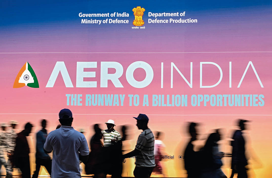 2月14日,在印度班加罗尔耶拉汉卡空军基地举行的第15届印度航展上,观众从一处航展标识背景板前经过