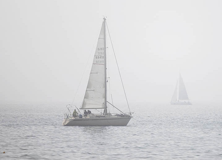 3月15日,在希腊雅典附近的帕拉约法利罗,帆船在烟雾笼罩的海上航行