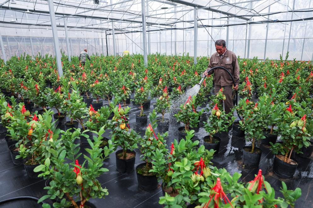10月22日,在位于金华市金东区赤松镇北山口村的现代化佛手种植大棚,养殖户给佛手盆景浇水。