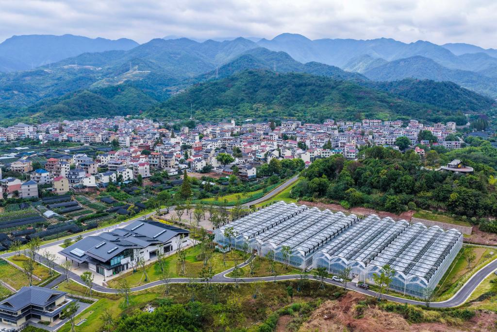 10月22日拍摄的金华市金东区赤松镇北山口村的金华佛手农林服务中心(左下),旁边是配套的现代化佛手种植大棚(无人机照片)。