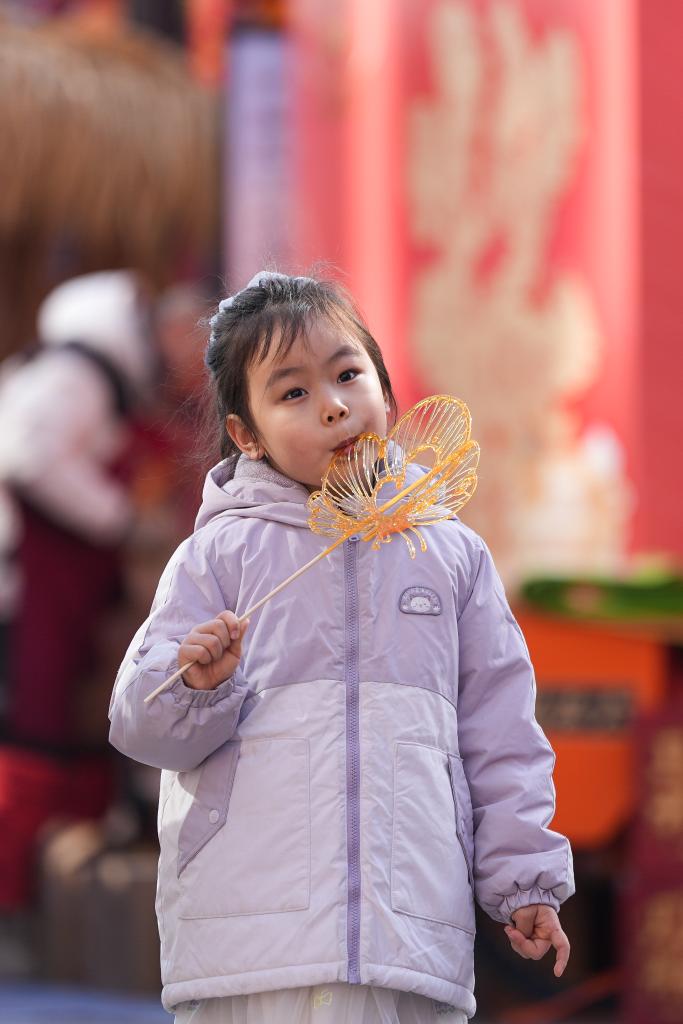 2月12日,一名小朋友在北京市东城区2026隆福寺新春市集吃糖画。