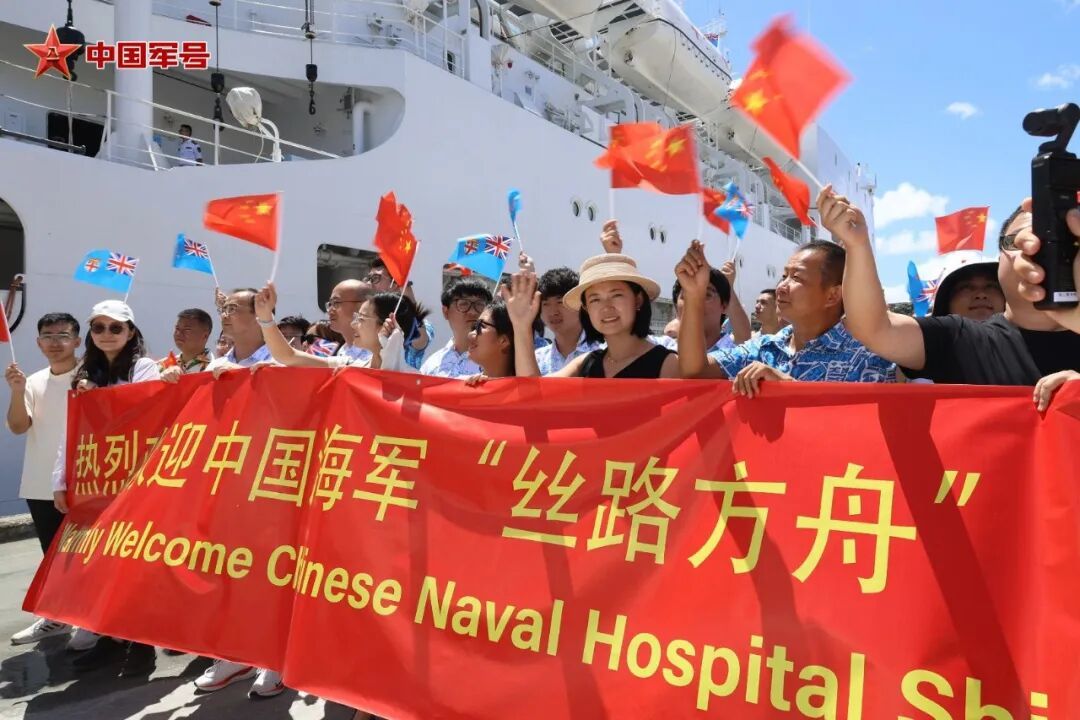 码头上,斐济国防军参谋长萨佩纳法率队迎接,军乐队奏响迎宾乐曲;中国驻斐济大使馆工作人员、当地中资机构代表及华人华侨手持国旗,热烈欢迎“丝路方舟”医院船的到来,现场洋溢着中斐友好的浓厚氛围。