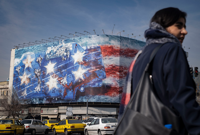 1月27日,伊朗德黑兰,恩格拉布广场巨型广告牌,伊朗警告美国不要试图对伊朗发动军事打击。(视觉中国)