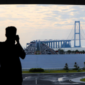 10月25日,游客在深中通道西人工岛上的粤港澳大湾区跨海通道科普基地内参观。