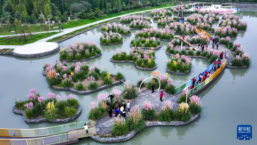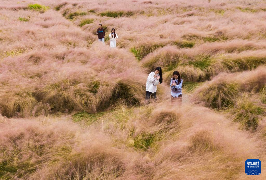 10月25日,游客在浙江省金华职业技术大学校园观赏、拍摄粉黛乱子草(无人机照片)。