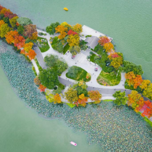 10月25日,游客在江苏省扬州市珠湖小镇赏秋游玩(无人机照片)。