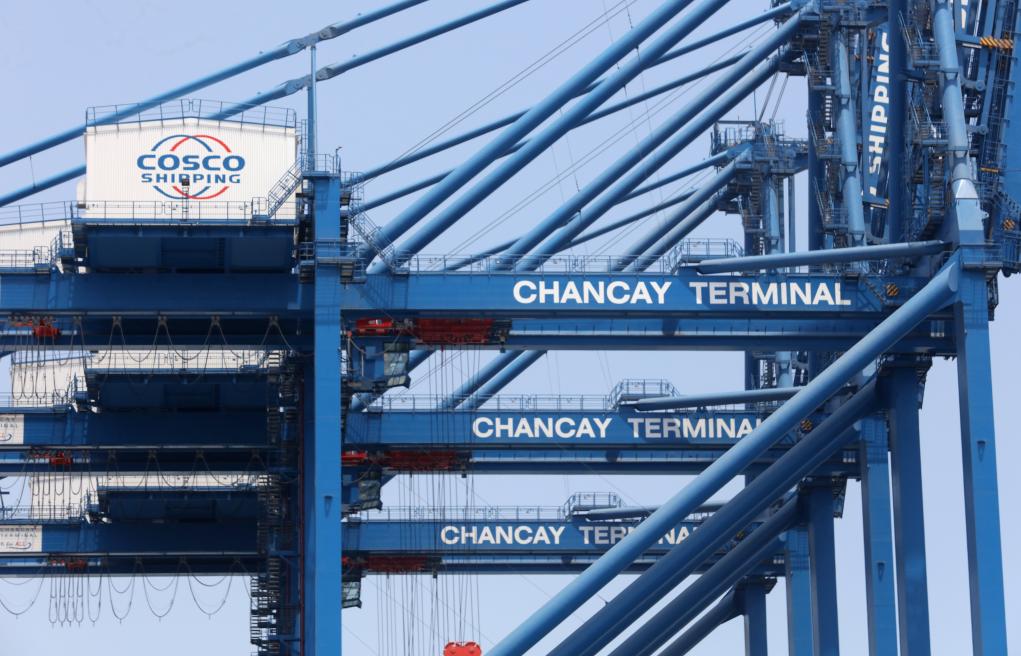 这是10月7日在秘鲁钱凯港拍摄的印有“中远海运”“钱凯码头”字样的轨道吊。