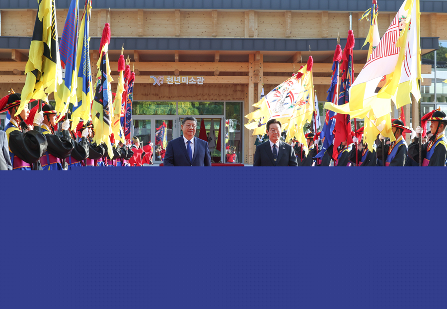 当地时间11月1日下午,韩国总统李在明同中国国家主席习近平在庆州博物馆举行会谈。这是习近平在李在明陪同下检阅仪仗队。