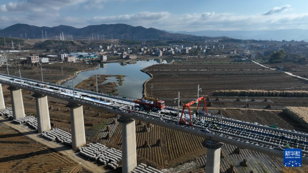 12月7日,在云南省昭通市昭阳区守望回族乡,中铁二局工人在渝昆高铁卡子村特大桥进行无砟道床作业。