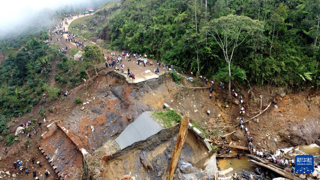 12月9日,在印度尼西亚亚齐省,一座桥因洪灾损毁(无人机照片)。