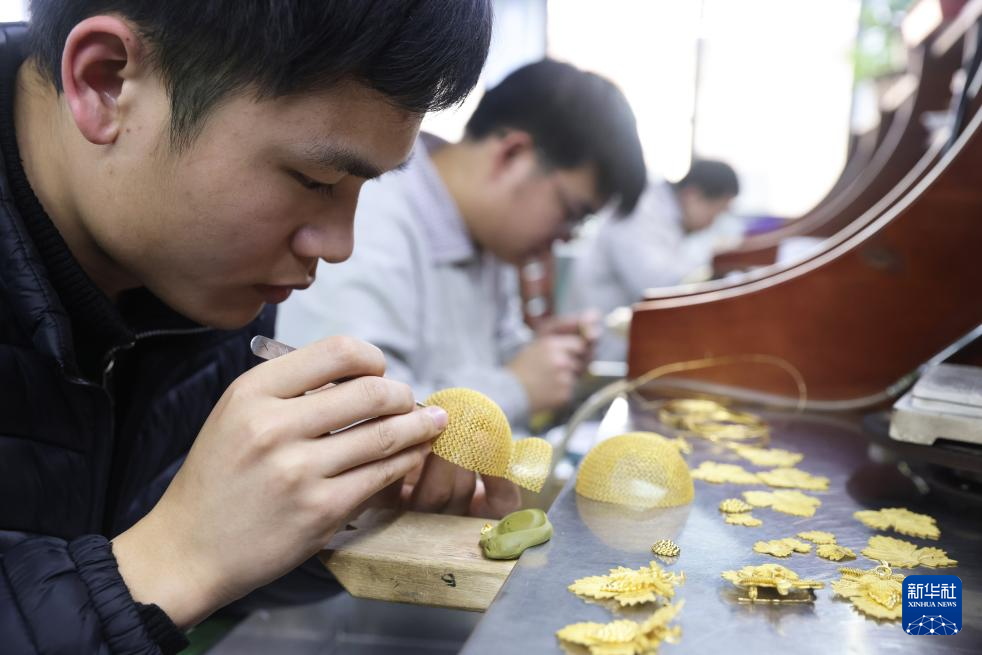 1月28日,员工在位于浙江省杭州市萧山区瓜沥镇的杭州航民百泰首饰有限公司车间加工黄金葫芦摆件。