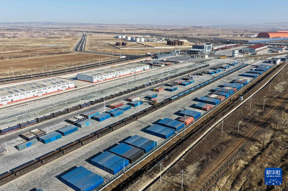 1月27日,中欧班列从乌兰察布中欧班列集散中心驶出(无人机照片)。