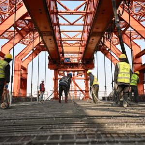 1月28日,在东莞市滨海湾新区的深江铁路跨沿江高速特大桥施工现场,中铁十一局工人在进行浇筑工作。