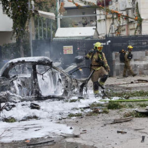 3月15日,安全人员和应急人员在以色列中部城市特拉维夫的导弹袭击现场工作。