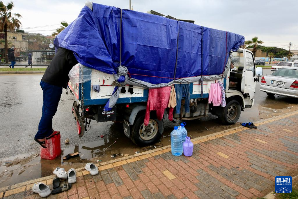 3月15日,在黎巴嫩南部赛达市附近的一条公路旁,黎巴嫩流离失所者在汽车帐篷内避雨。