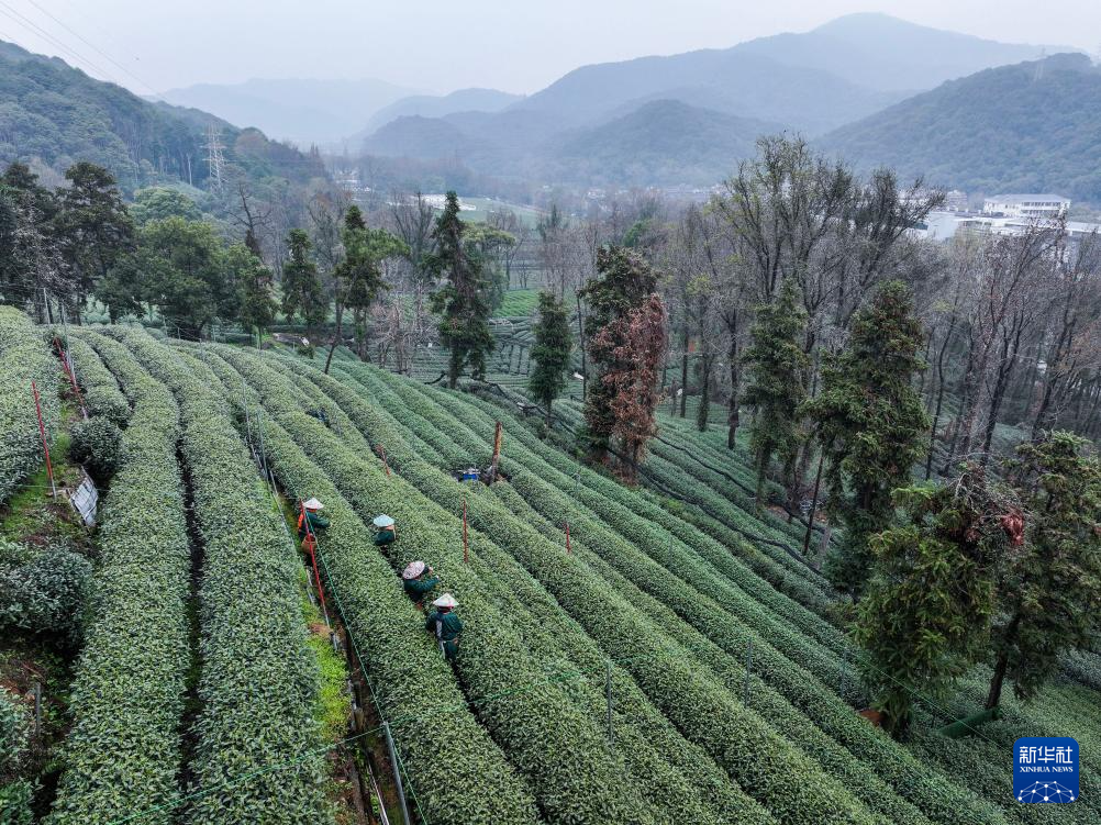 3月19日,梅家坞村的茶农在茶山上采摘西湖龙井“明前茶”(无人机照片)。
