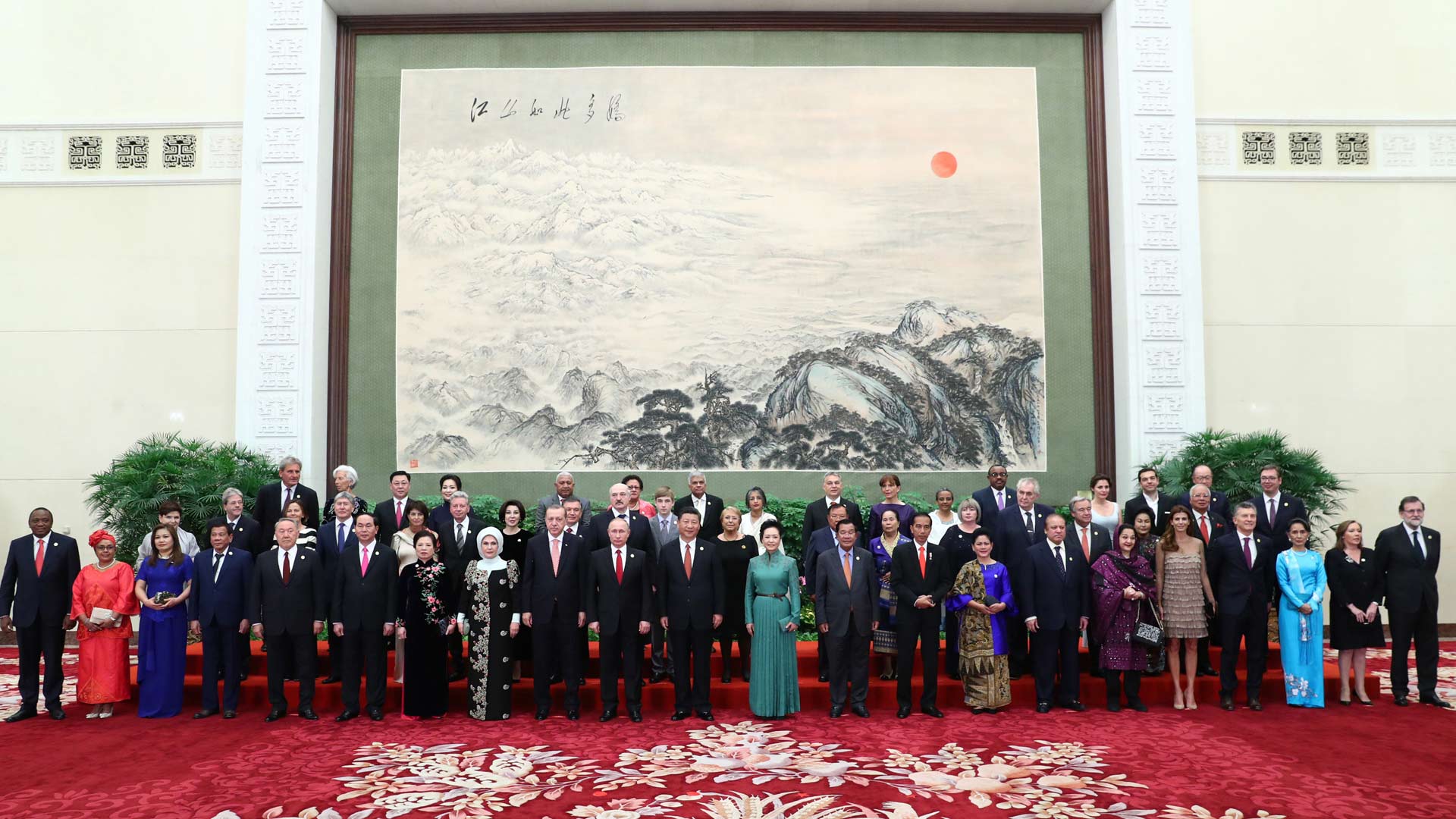 5月14日,國家主席習(xí)近平在北京人民大會(huì)堂舉行宴會(huì),歡迎出席“一帶一路”國際合作高峰論壇的外方代表團(tuán)團(tuán)長(zhǎng)及嘉賓。這是習(xí)近平和夫人彭麗媛同外方代表團(tuán)團(tuán)長(zhǎng)及配偶集體合影留念。新華社記者 謝環(huán)馳 攝