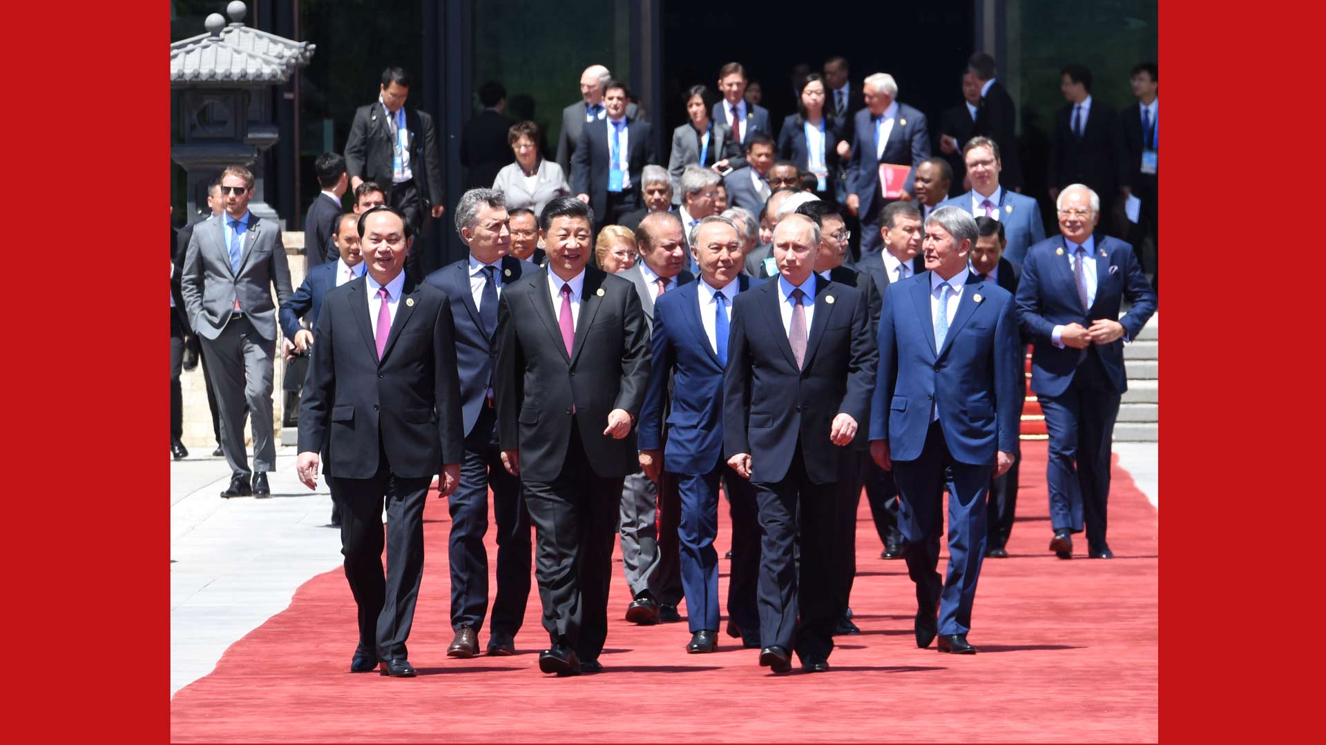 5月15日,“一帶一路”國際合作高峰論壇圓桌峰會(huì)在北京雁棲湖國際會(huì)議中心舉行,國家主席習(xí)近平主持會(huì)議并致開幕辭。這是第一階段會(huì)議結(jié)束后,習(xí)近平同外方代表團(tuán)團(tuán)長(zhǎng)及嘉賓步出雁棲湖國際會(huì)議中心。新華社記者 饒愛民 攝