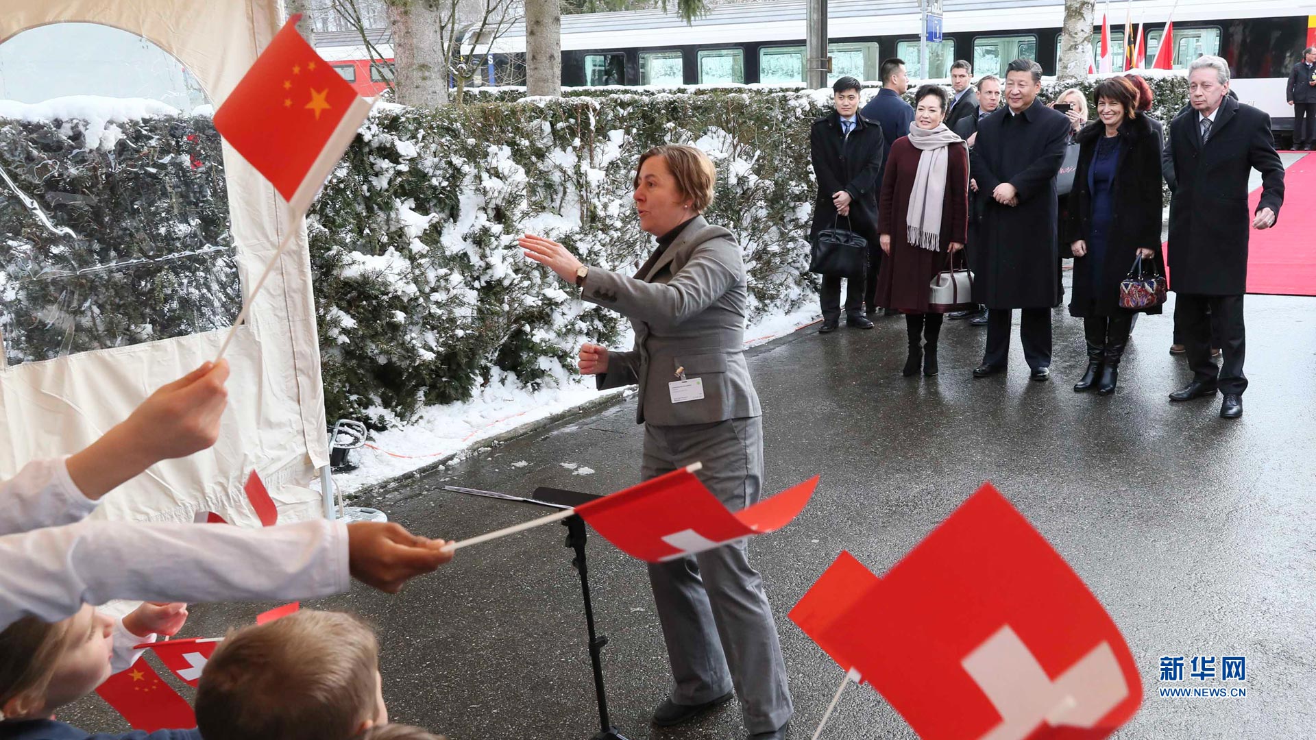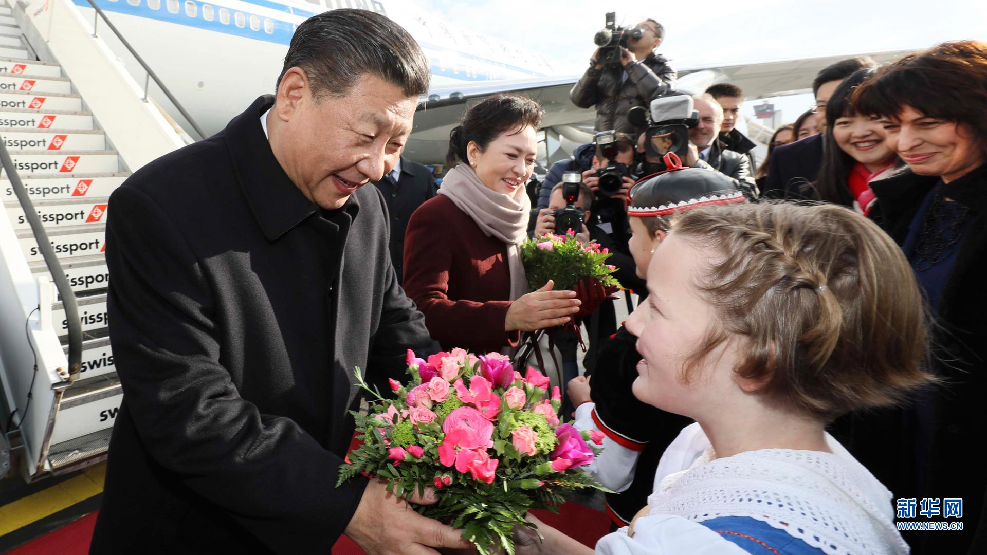 1月15日,國家主席習(xí)近平乘專機(jī)抵達(dá)蘇黎世,開始對瑞士聯(lián)邦進(jìn)行國事訪問。這是當(dāng)?shù)貎和蛄?xí)近平和夫人彭麗媛獻(xiàn)上鮮花。新華社記者蘭紅光攝2017-01-16